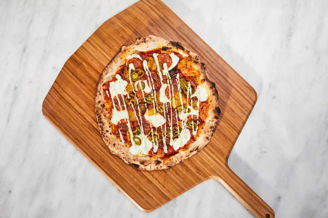 Before baking our pizza, we spend a few minutes cooking thinly sliced fresh pineapple in our Ooni oven for a flame-cooked fruit with delicious bits of char and small pockets of juiciness. Combine that with pepperoni — a classic brand from your supermarket deli will work just fine here — and sliced, pickled jalapeños, and this pizza takes a big step up from the canned pineapple original that Canadian restaurant owner Sam Panopoulos is credited with creating back in 1962.