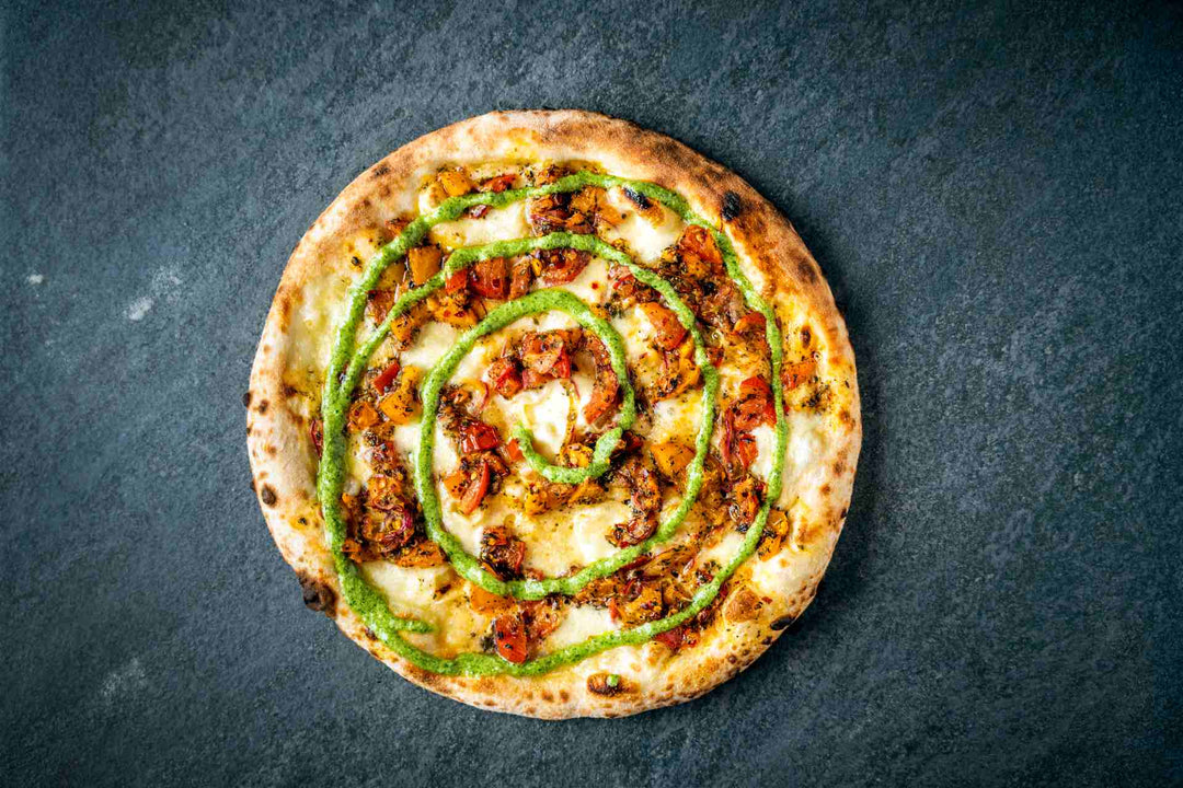While there are many variations of pesto (in Italy, it’s a term used for any puréed sauce, usually made with a mortar and pestle), one of the most familiar is pesto alla Genovese. It combines Genovese basil from the coastal region of Liguria, garlic, pine nuts, Parmigiano-Reggiano and/or Pecorino Fiore Sardo, extra-virgin olive oil and salt. Nothing more, nothing less. For our version, we’ve added lemon juice for a dash of brightness; set atop a thin and crispy dough, the bright green pesto makes for a stunning visual. Add to that the heirlooms’ natural sweetness and juiciness, plus fresh mozzarella, and you’ll get peak summertime in every bite. In other words, it’s the smell – and taste – of the season of the sun.