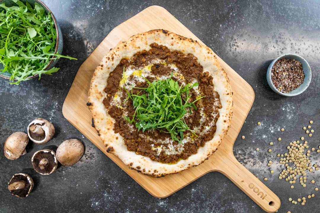 We’ve taken direct inspiration from the Mushroom Ragu recipe in his book Ottolenghi Flavor: A Cookbook and adapted it for cooking in your Ooni pizza oven. Not only does it make a delicious pasta sauce, it builds a standout base for a hearty ragu pizza. Add cream and arugula as toppings, and you’ve got a balanced pizza that’s great for quick weeknight dinners but also impressive for a weekend date night. It’s a bonus that the pizza is entirely plant-based, but if you’d prefer a bit of dairy, full-fat cream and grated pecorino romano will work in place of the vegetarian cream we’ve suggested below.