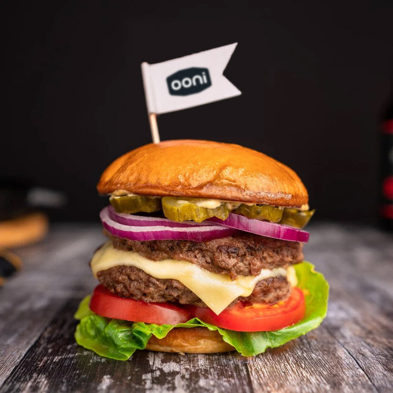 When that craving for burgers calls, fire up your Ooni pizza oven: our cast-iron flame-cooked double smash burger is stacked with gouda cheese, pickle, red onion, lettuce and tomato, and served between sweet butter-toasted brioche buns.